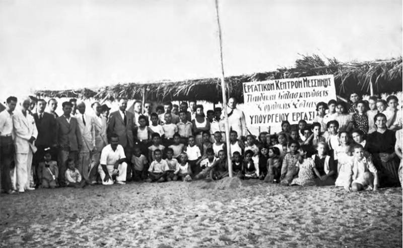 Στην πινακίδα διαβάζουμε: «Εργατικόν Κέντρον Μεσσήνης. Παιδικαί Κατασκηνώσεις Εργατικής Εστίας Υπουργείου Εργασίας».