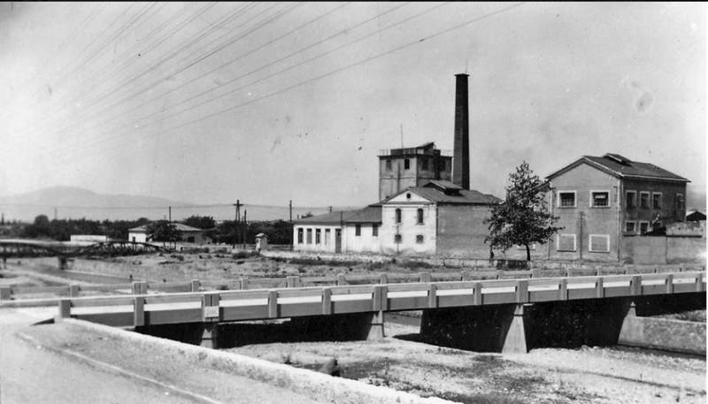 Καλαμάτα στα τέλη της δεκαετίας του 1950, η γέφυρα που είχε κατασκευαστεί πριν λίγο καιρό και το εργοστάσιο Λιναρδάκη.