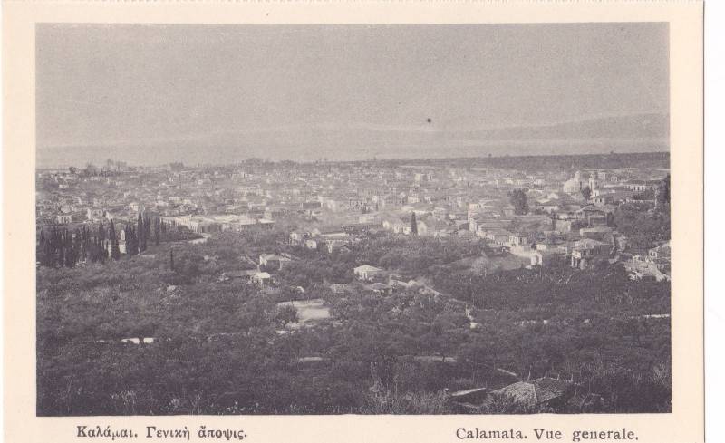 Πανοραμική άποψη της Καλαμάτας από τις Τούρλες γύρω στα 1930. [Φωτό από το eΒay]