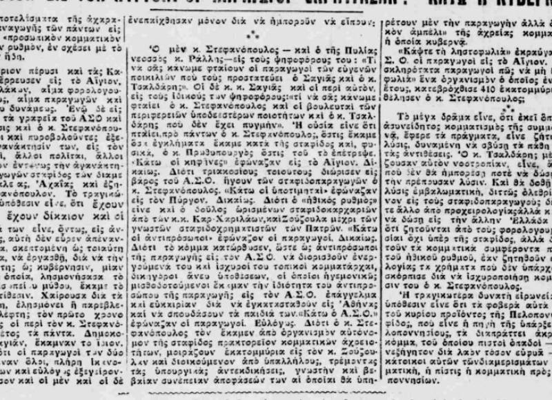Θέλομεν να ελπίζωμεν ή μάλλον πιστεύομεν ακραδάντως ότι τα θλιβερώτατα γεγονότα του Αιγίου δεν πρόκειται να έχουν συνέχειαν. Τα συλλαλητήρια των σταφιδοπαραγωγών τα οποία προητοιμάζοντο και εις άλλας περιφερείας λίαν ορθώς απηγορεύθησαν. Και αι τοπικαί αρχαί έλαβαν ασφαλώς τα ενδεδειγμένα μέτρα διά να ανταπεξέλθουν αποτελεσματικώς και αναιμάκτως εις τας μεθόδους των βενιζελικών πρακτόρων της αναρχίας. Παραλλήλως η κυβέρνησις θα δώσει λύσεις δικαίας και εις όλα εκείνα τα ζητήματα τα οποία συγκλονίζουν –βοηθούσης και της βενιζελικής δημαγωγίας – τον σταφιδοπαραγωγικόν κόσμον– λύσεις ανταποκρινομένας τόσον εις τα γενικώτερα συμφέροντα της στφιδοπαραγωγής όσον και εις τα επί μέρους συμφέροντα των παραγωγών, κατά το δυνατόν. Και η αντιπολίτευσις θα χάση ούτω την ευκαιρίαν να καλλιεργήση εις ευρυτέραν κλίμακα τας μεθόδους της “αγκιτάτσιας” και της “προβοκάτσιας” εφαρμόζουσα το σωτήριον πρόγραμμά της του “εμφυλίου σπαραγμού» (1048).