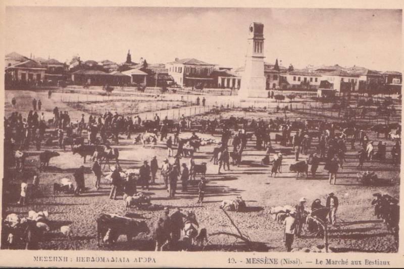 "Εβδομαδιαία αγορά" στο Νησί γύρω στα 1930. Το πάρκο μόλις έχει αρχίσει να διαμορφώνεται και το ρολόι δεν έχει τοποθετηθεί ακόμη.