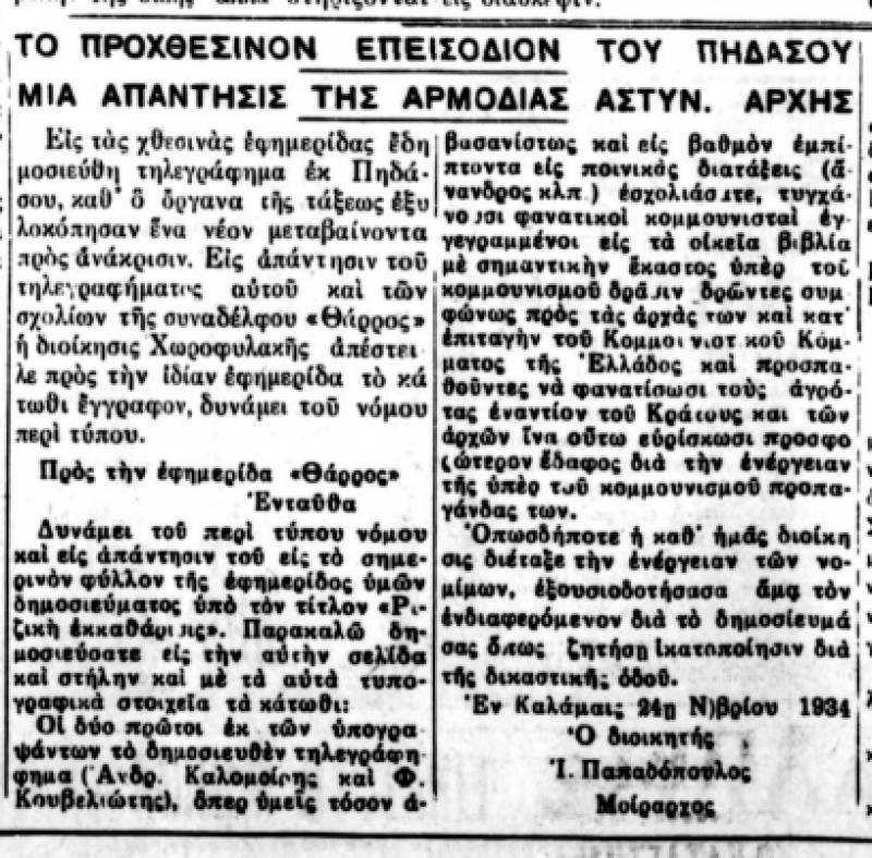 Οι δύο εκ των υπογραψάντων το δημοσιευθέν τηλεγράφημα (Ανδρ. Καλομοίρης και Φ. Κουβελιώτης), όπερ υμείς τόσον αβασανίστως και εις βαθμόν εμπίπτοντα εις ποινικάς διατάξεις (άνανδρος κλπ.) εσχολιάσατε, τυγχάνουσι φανατικοί κομμουνισταί εγγεγραμμένοι εις τα οικεία βιβλία με σημαντικήν έκαστος υπέρ του κομμουνισμού δράσιν, δρώντες συμφώνως προς τας αρχάς των και κατ’ επιταγήν του Κομμουνιστικού Κόμματος της Ελλάδος και προσπαθούντες να φανατίσωσι τους αγρότας εναντίον του Κράτους και των αρχών ίνα ούτω ευρίσκωσι προσφορώτερον έδαφος διά την ενέργειαν της υπέρ του κομμουνισμού προπαγάνδας των. Οπωσδήποτε η καθ’ ημάς διοίκησις διέταξε την ενέργειαν των νομίμων, εξουσιοδοτήσασα άμα τον ενδιαφερόμενον διά το δημοσίευμά σας όπως ζητήση ικανοποίησιν διά της δικαστικής οδού – Ο διοικητής Ι. Παπαδόπουλος, μοίραρχος» (1117).