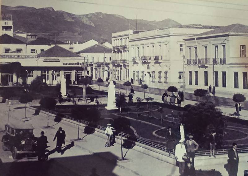 Η καρτ ποστάλ με τη γνωστή λήψη τμήματος της κεντρικής πλατείας αναφέρεται σε "Πλατεία Ηρώων".