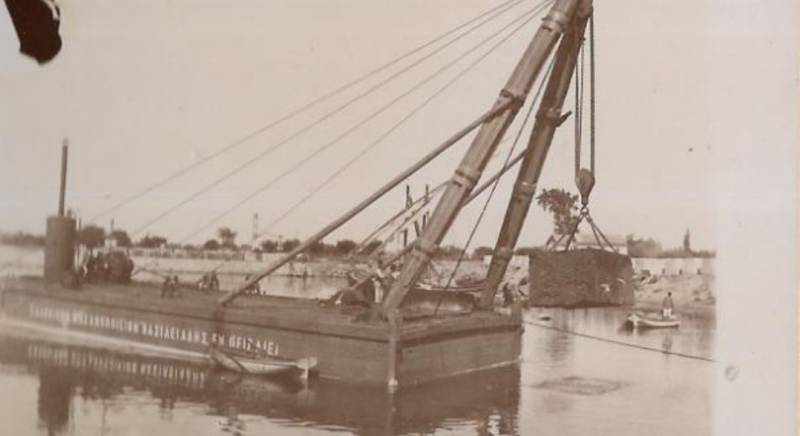 Μια εικόνα από τις εργασίες κατασκευής του λιμανιού της Καλαμάτας μεταξύ 1897-1900.
