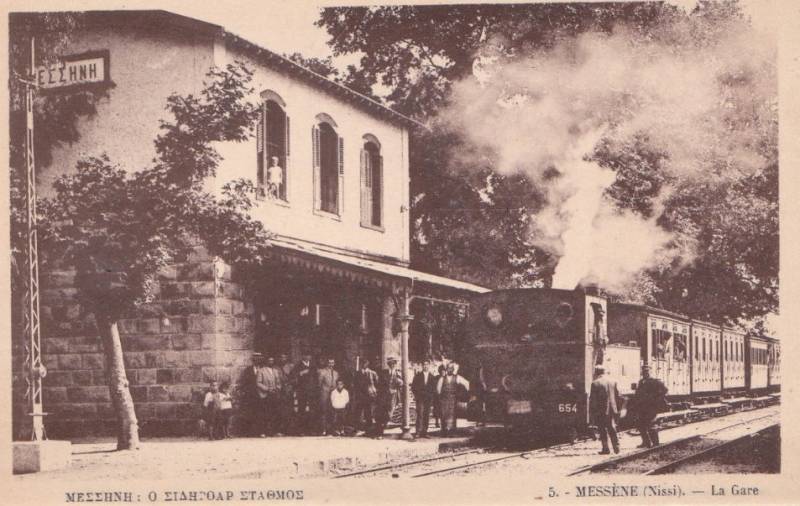 Ο σιδηροδρομικός σταθμός της Μεσσήνης γύρω στα 1930 [Από καρτ-ποστάλ]