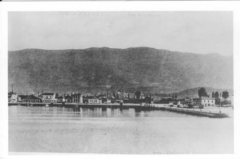 Οψη της Παραλίας από τον λιμενοβραχίονα πριν κατασκευαστεί το "Πανελλήνιον". [Από καρτ ποστάλ]