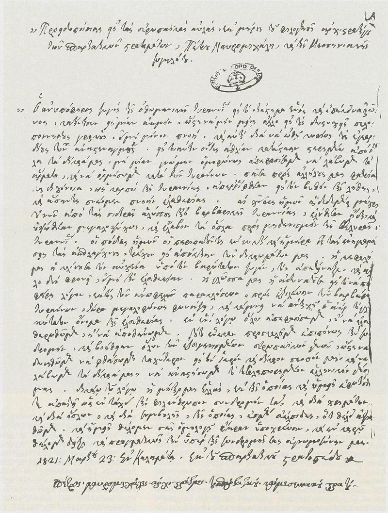 γ) Από 12 Μαΐου 1821 χωρίς τίτλο, που απευθύνεται «ἐκ μέρους τοῦ ἐξοχωτάτου Πέτρου Μαυρομιχάλη, ἀρχιστράτηγου τῶν Πελοποννησιακῶν ἁρμάτων καὶ τῆς ἐν Καλαμάτᾳ Μεσσηνιακῆς Συγκλήτου» προς τις αρχές των Ηνωμένων Kρατών των Ιονίων Νήσων.