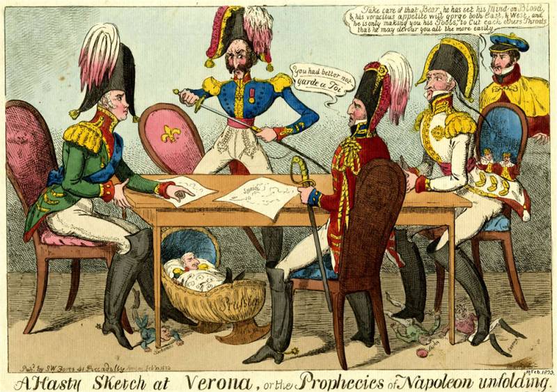 για την Αγγλία ο 1ος δούκας του Wellington Arthur Wellesley, που διαδέχθηκε τον Robert Stewart, υποκόμη του Castlereagh που είχε αυτοκτονήσει πριν περίπου δύο μήνες, στις 12 Αυγουστου. (Μετά την αυτοκτονία του Castlereagh ανέλαβε υπουργός εξωτερικών της Αγγλίας ο George Canning και ο Wellesley δούκας του Wellington στάλθηκε στη Βερόνα σαν αντιπρόσωπός του),