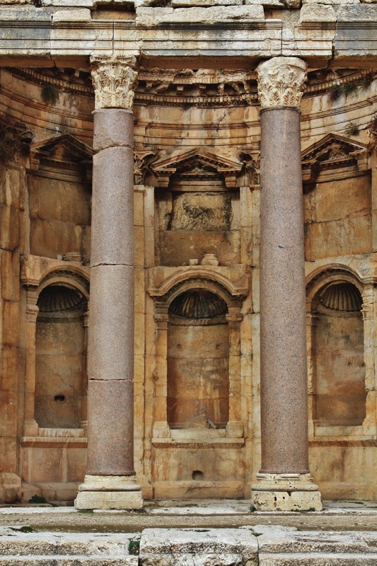 Αλλά σε αριθμό υποδεέστερο από όσες πήρε ο δόγης. Το Εξαγωνικό Προαύλιο (195-217 μ. Χ.) και η Μεγάλη Πλατεία (117-161 μ. Χ.) (εικ. 12) στο Μπάαλμπεκ βορειονατολικά της Τύρου, κοσμούνται με δεκάδες μονολιθικές κολόνες από ερυθρωπό συενίτη οι οποίες έχουν ακριβώς τις ίδιες διαστάσεις και μορφή αστραγάλων με αυτές των κιόνων στο κάστρο και ναυάγιο Μεθώνης.