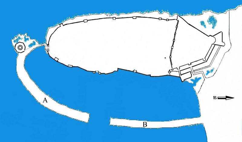 Η γραπτή μαρτυρία και οι χάρτες του αυτόπτη μάρτυρα, πολιορκητή το 1500 και με διαδοχικές διαμονές στη Μεθώνη ναύαρχου και χαρτογράφου Piri Reis δίνουν την οριστική απάντηση τόσο για τη μορφή του λιμανιού όσο και για την κατασκευή του πύργου. Το λιμάνι έκλεινε με δυο λιμενοβραχίονες, με τον δεύτερο να έχει ελαφρά καμπυλωτό σχήμα, και αφήνοντας ένα άνοιγμα από τον παλιό, συνέχιζε προς την παραλία παράλληλα με το κάστρο (εικ. 2).