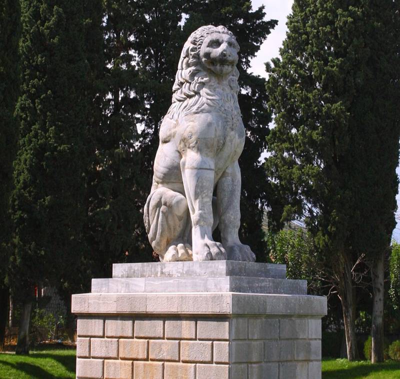 (Φωτογραφία: Το μαρμάρινο «Λιοντάρι της Χαιρώνειας» - Χτίστηκε από τους Θηβαίους στη μνήμη των πεσόντων ανδρών του Ιερού Λόχου, μετά τη νίκη του Φίλιππου το 338 π.Χ.)