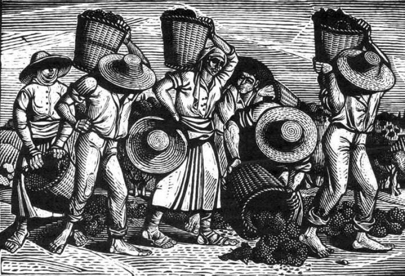 Και έφτανε η ώρα του τρύγου: Δανεικαριές στη Στέρνα, μόνιμοι εργάτες από Πολιανή και Γαρδίκι στο Φαρμίσι, πόλεμος για τη συγκομιδή. Οι τεράστιες κόφες στην πλάτη που έτρεχε ποτάμι ο ιδρώτας, ακολουθούμενες από σφήκες και σκούρκους, ξάπλωμα στο αλώνι, οι λιγότερο δυνάμενοι στο άπλωμα με τα χέρια για να είναι αριά-αριά τα τσαμπιά και να ξεραθούν χωρίς να κρατάνε υγρασία.