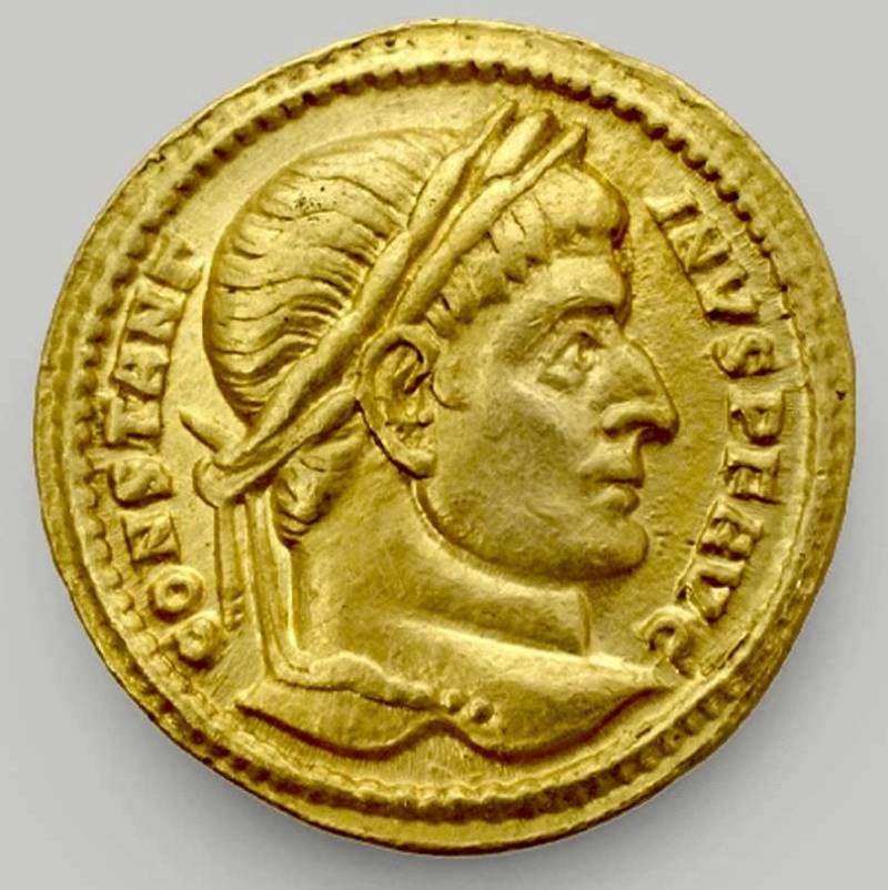 [Φωτογραφία: Χρυσός σόλιδος Μεγάλου Κωνσταντίνου. Κεφαλή Μεγάλου Κωνσταντίνου, με την επιγραφή «CONSTANTI NVSPFAVG», Constantinus P(ius) F(elix) Aug(ustus). Δηλαδή: «Κωνσταντίνος, Ευσεβής και Ευλογημένος Αύγουστος»].