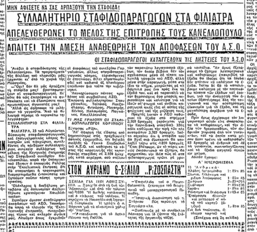 «Η Πελοπόννησος ανάβει. Οι σταφιδοπαραγωγοί ξεσηκώνονται ενάντια στους εκμεταλλευτές τους, ενάντια στον Αυτόνομο Σταφιδικό Οργανισμό (ΑΣΟ). Και απαιτούν από την κυβέρνηση να ικανοποιήσει τα δίκαια αιτήματά τους. Δύο βασικά γνωρίσματα ξεχωρίζουν το φετεινό ξεσήκωμα των σταφιδοπαραγωγών από τις κινητοποιήσεις τους των περασμένων χρόνων. Το πρώτο είνε ότι φέτος οι σταφιδοπαραγωγοί δεν παλεύουν διασπασμένα και χωριστά κατά περιοχή. Είνε συσπειρωμένοι όλοι γύρω από το πρόγραμμα διεκδικήσεων που επεξεργάστηκε το συνέδριο των Γαργαλιάνων. Φέτο, για πρώτη φορά στην ιστορία των μακρόχρονων αγώνων τους, οι σταφιδοπαραγωγοί δεν βαδίζουν στα τυφλά. Ξέρουν καθαρά τι τους φταίει και τι ζητούν. Βλέπουν την ιστορία της συμφοράς τους κατά πρόσωπο. Γνωρίζουν τον εχθρό: Την αχόρταγη και απαίσια φαγάνα, τον Αυτόνομο Σταφιδικό Οργανισμό, που άσπλαχνα τους ρουφά τον κόπο, το θησαυρό τους. Γνωρίζουν, βλέπουν όλη την εγκληματική φάρα των βδελλών που μαζί με τον ΑΣΟ, δίπλα και πίσω του, ένα σκοπό έχει: να στραγγαλίσει μέχρι τον πάτο τον σταφιδοπαραγωγό για να θησαυρίσει αυτός. Το δεύτερο γνώρισμα είνε ότι πιο ξεκάθαρα από κάθε άλλη φορά φέτο οι σταφιδοπαραγωγοί ξέρουν πώς να διεκδικήσουν αυτό που θέλουν. Και το πιο σημαντικό είνε ότι για πρώτη φορά στην ιστορία του σταφιδικού οι σταφιδοπαραγωγοί φέτος απευθύνονται σ' όλους τους εργαζόμενους της χώρας και πρώτ' απ' όλα τις εργατικές οργανώσεις και ζητάν την ενίσχυσή τους στον τίμιο αγώνα που διεξάγουν για το ψωμί τους. Ετσι ο δίκαιος αγώνας των σταφιδοπαραγωγών ξεφεύγει από τα στενά του πλαίσια και γίνεται πανελλαδική υπόθεση όλων των εργαζομένων. Το γεγονός αυτό αποχτά εξαιρετική πολιτική σημασία, ιδιαίτερα μέσα στις κρίσιμες συνθήκες που περνά σήμερα η χώρα μας. Και θα εξηγήσουμε γιατί: Είναι αλήθεια χρόνια πολλά η σταφίδα είτανε το μοναδικό σχεδόν προϊόν του τόπου που απ' αυτό ζούσε, όπως λένε, όλος ο τόπος, δηλαδή απ' αυτό έκλεβε και έτρεφε προκοίλια όλη η φάρα των τραπεζιτών, βιομηχάνων, μεγαλεμπόρων, τοκογλύφων, τσορμπατζήδων. Απ' αυτό, κυρίως, ρουφούσε το κράτος αφόρητους δασμούς και φόρους. Ολα αυτά τα βάρη είνε οι κύριες αιτίες της χρόνιας σταφιδικής κρίσης. Οι σταφιδοπαραγωγοί πάντα βρισκόντουσαν σε αγώνες που πολλές φορές εξελίχτηκαν σε ηρωικές εξεγέρσεις, ενάντια στην πολυκέφαλη αυτή καταλήστευση. Μα σχεδόν πάντοτε βρισκόντουσαν δημαγωγοί και πολιτικοί απατεώνες που τα κατάφερναν να πνίγουν και να ευνουχίζουν τους αγώνες αυτούς. Τα πράγματα αρχίζουν να χαλάνε ακόμα πιο πολύ με το ξέσπασμα της τελευταίας παγκόσμιας και ντόπιας οικονομικής κρίσης που πολύπλευρα χειροτέρευσε τη θέση της σταφίδας. Μα στα τελευταία χρόνια έχουμε και μερικές ακόμα αλλαγές. Πρώτα-πρώτα οι μακρόχρονες εσωτερικές πολιτικές διαμάχες, οι πολεμικές καταστροφές, η τελευταία κρίση εξασθένισαν και κλόνισαν σοβαρά την προνομιούχο θέση που είχε ο Μωρηάς, σ' ολόκληρη σειρά διοικητικών και άλλων τομέων [Βλέπουμε σε αντίθεση με την άλλη χώρα πόσο «λεύτερα» και εύκολα γίνονται αυτού συλλαλητήρια]. Αυτό άρχισε να υποσκάπτει τις στέρεες θέσεις που ο μωραΐτικος κοτσαμπασισμός είχε στα εργαζόμενα στρώματα της Πελοποννήσου. Και κάτω απ' την επίδραση της προόδου της πολιτικής χειραφέτησης των εργαζομένων της υπόλοιπης χώρας άρχισαν να παρουσιάζονται κι εδώ τα πρώτα σοβαρά ρήγματα στη μαζική βάση του πελοποννησιακού συντ