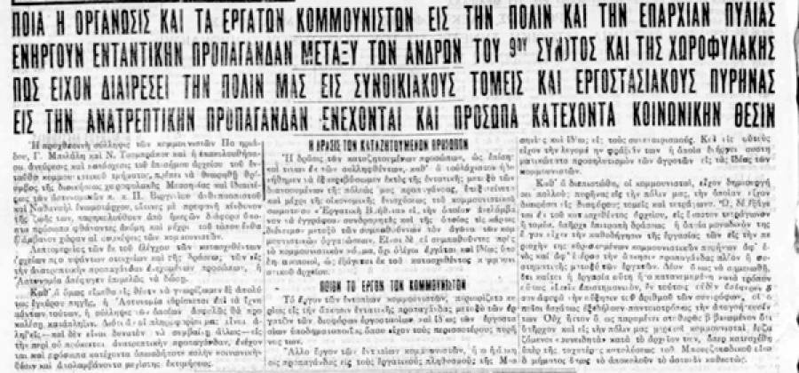 Φαίνεται δε ότι και εις την Πυλία ευρίσκοντο ή ευρίσκονται τα αποφασιστικότερα στελέχη των. Αλλωστε τούτο το απέδειξε και η προχθεσινή δίκη των κομμουνιστών καθ' ήν διεπιστώθη ότι και εις τα μικρότερα χωριά της Πυλίας, ως είναι η Ταβέρνα, η Λαχανάδα, η Λογγά, το Χαρακοποιό, η Κορώνη και άλλα μεγαλύτερα χωριά, υπάρχουν κομμουνιστικοί πυρήνες εν πλήρει δράσει.