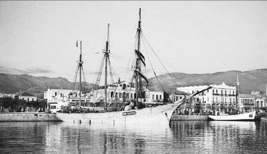 Ιστιοφόρο αγκυροβολημένο στην ανατολική προκυμαία. Δεξιά διακρίνεται το ξενοδοχείο «Αμέρικα» ιδιοκτησίας οικογένειας Σαμαρτζή.