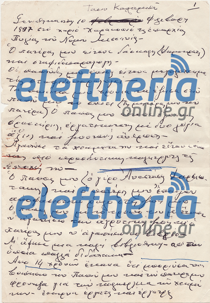 «Γεννήθηκα στις 10 Φλεβάρη 1897 στο χωριό Χαρακοπιό της επαρχίας Πυλίας του Νομού Μεσσηνίας.
