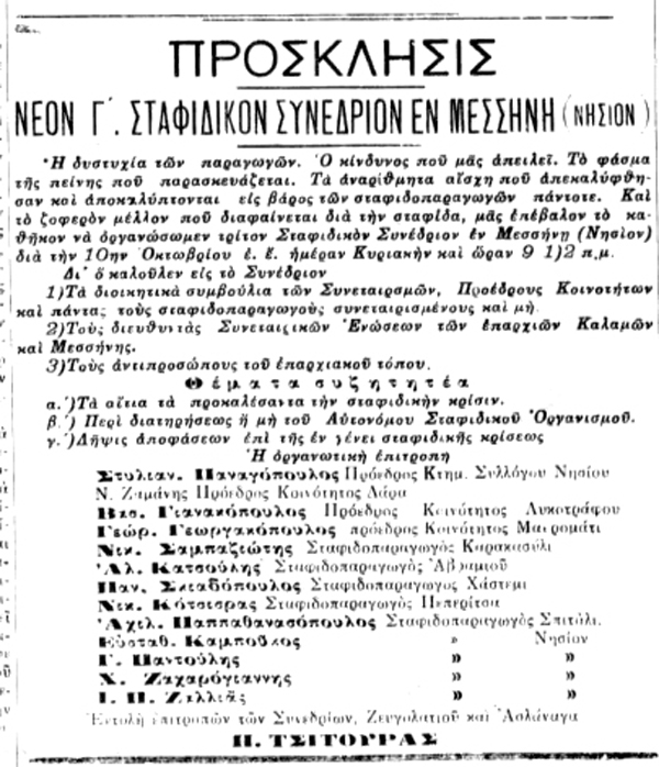 Τρίτο κατά σειρά συνέδριο των αντιδρώντων στη Μεσσήνη στην οργανωτική επιτροπή του οποίου συμμετέχουν οι: Στυλιαν. Παναγόπουλος πρόεδρος Κτηματικού Συλλόγου Νησιού, Ν. Ζαμάνης πρόεδρος Κοινότητας Δάρα, Βασ. Γιαννακόπουλος πρόεδρος Κοινότητας Λυκοτράφου, Γεωργ. Γεωργακόπουλος πρόεδρος Κοινότητας Μαυρομματίου, Νικ. Σαμπαζιώτης σταφιδοπαραγωγός Καρακασίλι, Αλ. Κατσούλης σταφιδοπαραγωγός Αβραμιού, Παν. Σκιαδόπουλος σταφιδοπαραγωγός Χάστεμι, Νικ. Κότσιρας σταφιδοπαραγωγός Πιλαλίστρα, Αχιλ. Παπαθανασόπουλος σταφιδοπαραγωγός Σπιτάλι, Ευσταθ. Καμπούκος σταφιδοπαραγωγός Νησιού, Γ. Παντούλης σταφιδοπαραγωγός Νησιού, Χ. Ζαχαρόγιαννης σταφιδοπαραγωγός Νησιού, Ι. Π. Ζαλμάς σταφιδοπαραγωγός Νησιού (53).