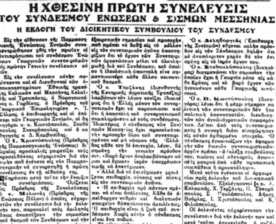 Τις ίδιες ημέρες πραγματοποιείται η ιδρυτική συνέλευση του Συνδέσμου Ενώσεων Γεωργικών Συνεταιρισμών. Τις εργασίες της συνέλευσης ανοίγει ο πρόεδρος της Παμμεσσηνιακής Ενωσης Ι. Χριστόπουλος και προεδρεύει ο Μυλωνάς, πρόεδρος της Ενωσης Πύλου. Σύμφωνα με το ρεπορτάζ από τις εργασίες της συνέλευσης: "Ο κ. Πουλόπουλος (πρόεδρος της Κεντρικής Αγροτικής Τράπεζας) τονίζει την σημασίαν του θεσμού και παρατηρεί ότι η ημέρα της πρώτης συνελεύσεως είναι μία από τας ιστορικάς του συνεργατισμού.
