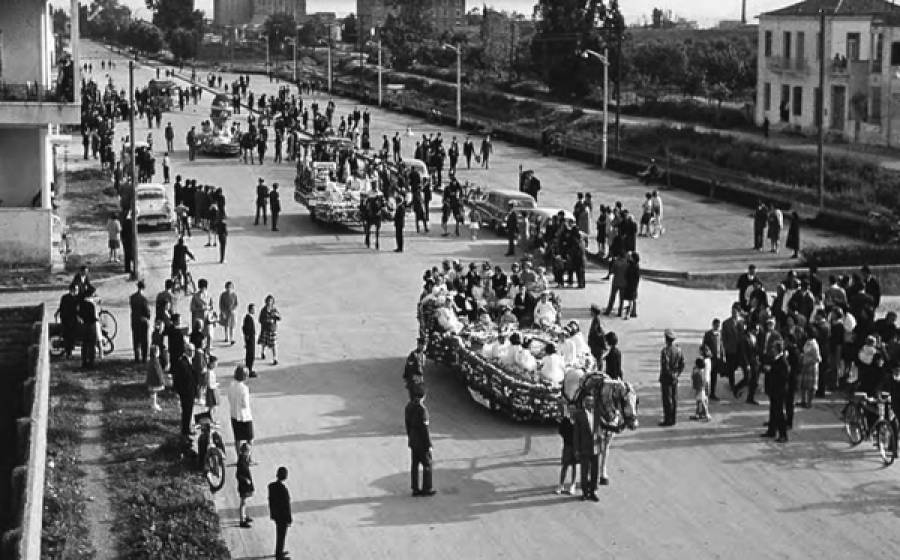 Στη φωτογραφία τμήμα της παρέλασης το 1965, στην Αριστομένους και στο σημείο στο οποίο βρίσκεται σήμερα η είσοδος του Πάρκου Σιδηροδρόμων (συμβολή με Πλάτωνος - Μακεδονίας). Προηγείται