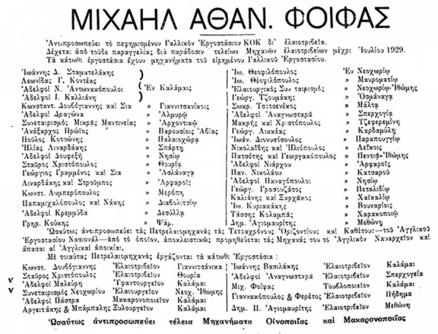 (268) Στο διάστημα από την άνοιξη μέχρι και το καλοκαίρι του 1929 υπάρχει συνεχώς διαφήμιση της εταιρείας Φοίφα στις τοπικές εφημερίδες η οποία προμηθεύει μηχανήματα γαλλικής εταιρείας για τα ελαιοτριβεία με κατάλογο εκείνων οι οποίοι ήδη έχουν πάρει τον εξοπλισμό. Στον κατάλογο των 37 ελαιοτριβείων στον οποίο υπάρχουν όλες οι μεγάλες επιχειρήσεις της Μεσσηνίας στον ελαιουργικό τομέα, υπάρχει και το ελαιοτριβείο του Τάση Κουλαμπά στο Χαρακοπιό.
