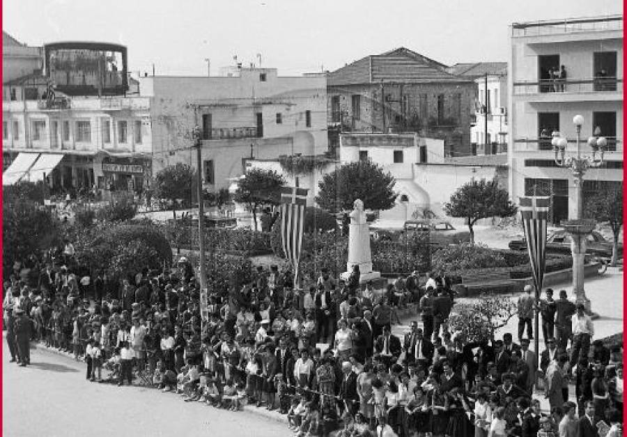 Κόσμος συγκεντρωμένος στην πλατεία για κάποια παρέλαση, με φόντο τα θερινά σινεμά "Εσπερος" και "Τριανόν".