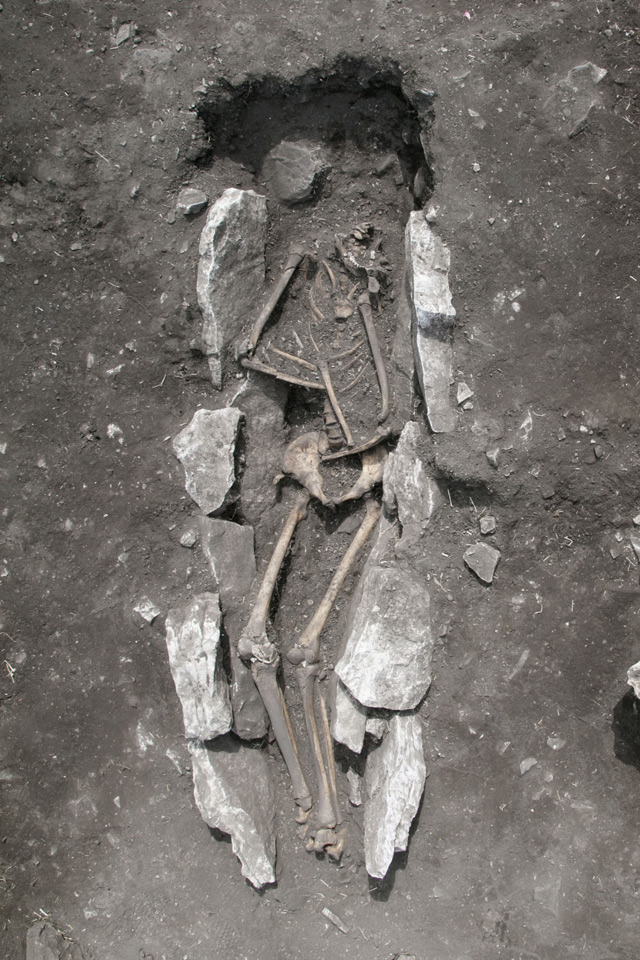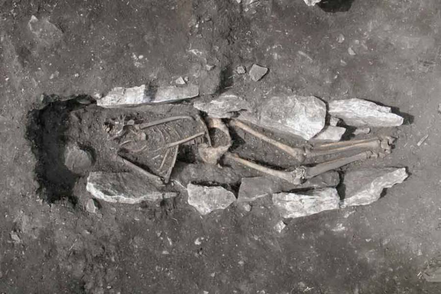 Σύμφωνα με την ανακοίνωση του ΥΠΠΟΑ, ο σκελετός, σε ύπτια θέση και σε άριστη κατάσταση διατήρησης, είχε αποτεθεί εντός στενού ορύγματος, που δημιουργήθηκε μέσα στις επιχώσεις από την τέφρα και τα καμένα χώματα. Λείπει μόνο το κρανίο του νεκρού, ενώ σώζεται η κάτω γνάθος.