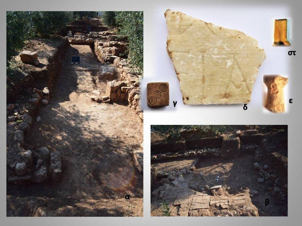 Στο εσωτερικό των παραπάνω χώρων εντοπίστηκαν επιστήλια, κιονίσκοι και άλλα αρχιτεκτονικά, καθώς και ένας πυθαμφορέας, ο οποίος βρέθηκε in situ, δηλαδή στο σημείο όπου είχε τοποθετηθεί κατά την τελευταία χρήση του. Στον ίδιο χώρο, στη θεμελίωση ενός τοίχου, εντοπίσθηκε εγχυτρισμός (ταφή μέσα σε αγγείο) με δύο ταφές εμβρύων. Επιπλέον, σε έναν από τους χώρους, η διερεύνηση του οποίου δεν ολοκληρώθηκε, αποκαλύφθηκε τμήμα πήλινου αγωγού μήκους 3,5 μ., ενώ συγκεντρώθηκε μεγάλος αριθμός ψηφίδων.