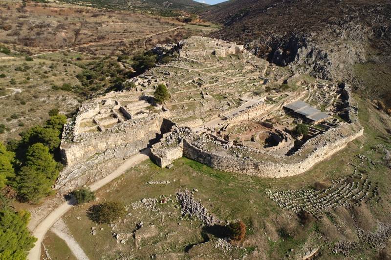 (Φωτογραφία: Η Ακρόπολη των Μυκηνών. Γενική άποψη από νοτιοδυτικά. Διακρίνονται: στα δεξιά η δυτική επέκταση της οχύρωσης με το Βασιλικό Ταφικό Περίβολο Α, τη Νότια Οικία, το Θρησκευτικό Κέντρο και τη ΝΔ Συνοικία. Στην κορυφή του λόφου το Ανακτορικό Συγκρότημα).