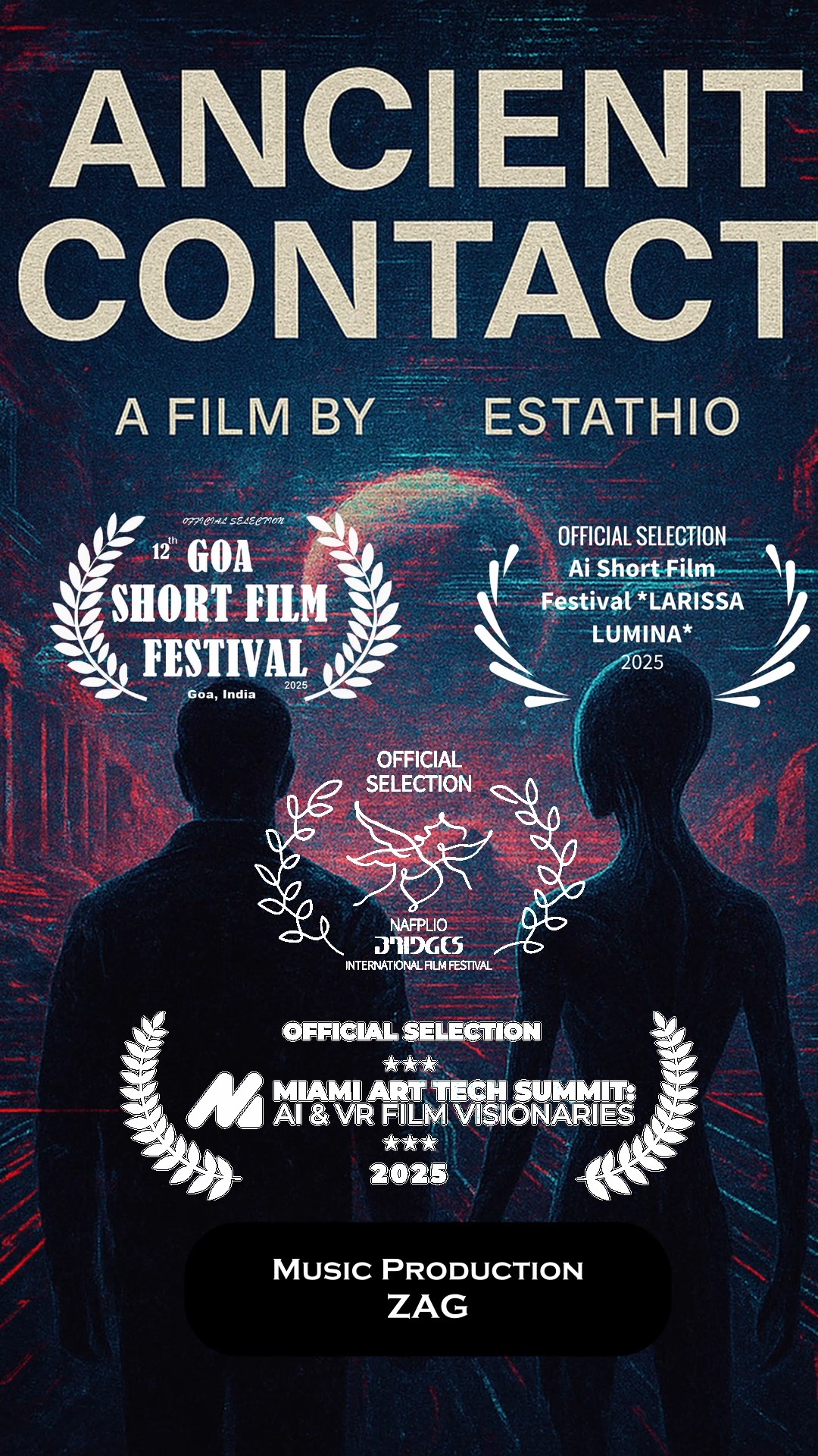 Το μουσικό βίντεο «Ancient Contact» του Στάθη Γιαννακόπουλου παρουσιάζει μια παράλληλη Γη όπου άνθρωποι και εξωγήινοι συνυπάρχουν αρμονικά. Με εικόνες και πλάνα δημιουργημένα ή επεξεργασμένα με τεχνητή νοημοσύνη, το έργο εξερευνά το μυστήριο, το ανθρώπινο στοιχείο, το μεταφυσικό και τη σχέση ανάμεσα στο παρελθόν και τις νέες τεχνολογίες. Τη μουσική παραγωγή υπογράφει ο Καλαματιανός DJ και παραγωγός της εγχώριας techno σκηνής Αντώνης Περιβολάρης (ZAG). Το βίντεο έχει ενταχθεί στο επίσημο πρόγραμμα των φεστιβάλ Larissa Alumina και GOA Film Festival στην Ινδία. Παράλληλα, ολοκληρώνει τον κύκλο των προβολών του με δύο σημαντικές στάσεις: στις 4 Δεκεμβρίου στο Art Basel Miami Beach, τη μεγαλύτερη έκθεση σύγχρονης τέχνης στις ΗΠΑ και στις 6 Δεκεμβρίου στο Φεστιβάλ Ναυπλίου «Γέφυρες». Η διαδικτυακή του κυκλοφορία αναμένεται στις αρχές του 2026.