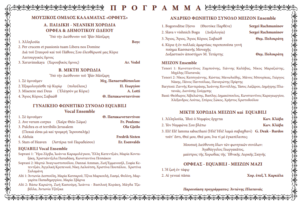 Η θρησκευτική χορωδιακή εκδήλωση τελεί υπό την αιγίδα του Σεβασμιωτάτου Μητροπολίτου Μεσσηνίας κ.κ. Χρυσοστόμου και συνδιοργανώνεται από το Σύλλογο «Οι Φίλοι Της Μουσικής Καλαμάτας» και το Μουσικό Ομιλο Καλαμάτας «Ορφεύς». Στην εκδήλωση θα φιλοξενηθούν η Παιδική-Νεανική Χορωδία του Ορφέα Καλαμάτας μαζί με την Παιδική-Νεανική Χορωδία του Δημοτικού Ωδείου Καλαμάτας, η Μικτή Χορωδία του Μουσικού Ομίλου Καλαμάτας «ΟΡΦΕΥΣ», το Ανδρικό Φωνητικό Σύνολο ΜΕΙΖΟΝ με μονωδούς και χορωδούς της Εθνικής Λυρικής Σκηνής, το Γυναικείο Φωνητικό Σύνολο Equabilis με μονωδούς και χορωδούς της Εθνικής Λυρικής Σκηνής. Θα ακουστούν χορωδιακά έργα θρησκευτικής μουσικής Ελλήνων και ξένων συνθετών.