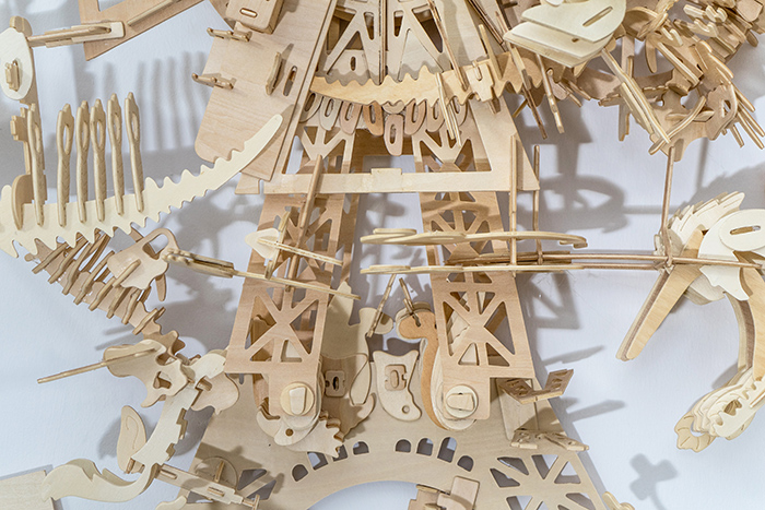Για την προετοιμασία της έκθεσης χρειάστηκαν πολλές ώρες, μέρες, μήνες χειρωνακτικής δουλειάς, πειθαρχίας, αμφισβήτησης και αυτοσυγκέντρωσης. Στο χώρο του εργαστηρίου μου, ο χρόνος άρχιζε να μετρά από την στιγμή που έβγαζα το κάθε ξύλινο κομμάτι από την προχαραγμένη πλάκα φυσικού ξύλου με αρίθμηση και το ταξινομούσα ανάλογα με το μέγεθος, σχήμα και την απαιτούμενη συνδεσμολογία. Η μανιώδης οργάνωση και παρατήρηση των ξύλινων κομματιών ήταν η βασική μεθοδολογία παραγωγής του εικαστικού μου υλικού, που άρχιζα να το συναρμολογώ και να το μορφοποιώ με όρους άλογους, διαφορετικούς και τυχαίους.