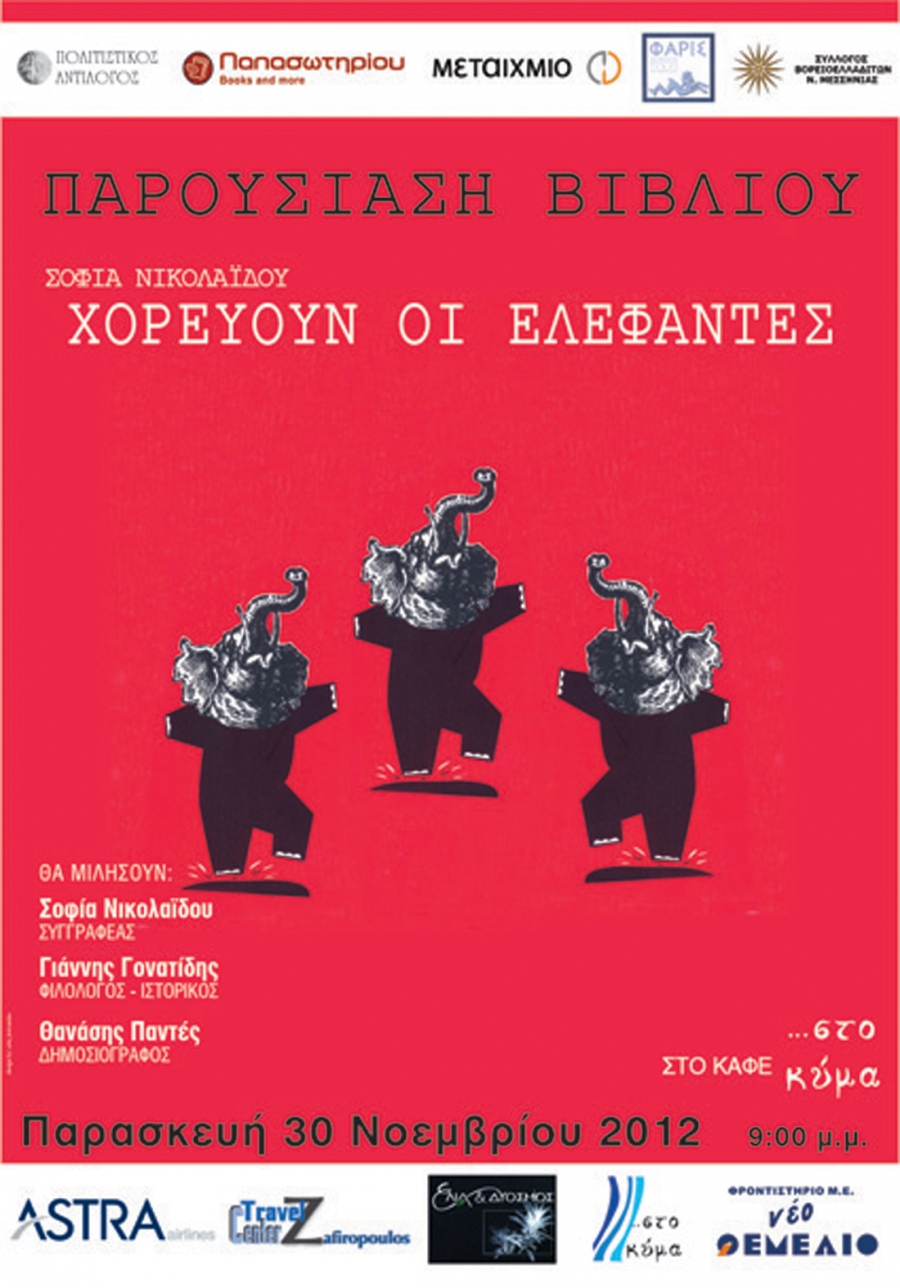 Στα 100 χρόνια από την απελευθέρωση της Θεσσαλονίκης είναι αφιερωμένο αυτό το διήμερο εκδηλώσεων που διοργανώνει ο "Πολιτιστικός Αντίλογος" σήμερα και αύριο. Υπό την αιγίδα της “Φάρις” και σε συνεργασία με τις εκδόσεις "Μεταίχμιο", το βιβλιοπωλείο "Παπασωτηρίου" και το Σύλλογο Βορειοελλαδιτών Μεσσηνίας, σήμερα στις 9 μ.μ. θα παρουσιαστεί το νέο βιβλίο της Σοφίας Νικολαΐδου "Χορεύουν οι ελέφαντες" στο καφέ "… Στο κύμα" Ναβαρίνου 167 στην παραλία της Καλαμάτας. Η συγγραφέας μίλησε στην "Ε" για το βιβλίο της με αφορμή την αποψινή παρουσίαση, για την ιστορία της Θεσσαλονίκης, αλλά και για το σήμερα.