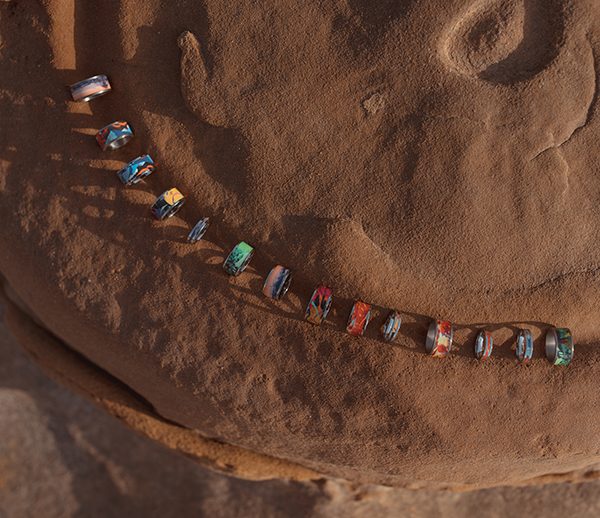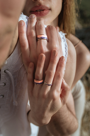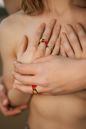 Χρησιμοποιούνται υλικά τόσο ανθεκτικά, που χρησιμοποιούνται ακόμα και σε διαστημόπλοια. Τα μέταλλα είναι το τιτάνιο, χειρουργικό ατσάλι, ανθρακόνημα και κεραμικό που βγάζουν τις ωμές αισθήσεις της γης. Μια ξεχωριστή συλλογή είναι το “Ceramics” όπου έχω δημιουργήσει ξεχωριστούς πίνακες με cyber punk χρώματα, τα οποία δείχνουν σκηνικά που διαδραματίζονται μέσα στο “Cosmic” κόμικ. Μεγάλης αντοχής μέταλλα μετατρέπονται με λεπτό σχεδιασμό σε δαχτυλίδια που κρατάνε για πάντα χωρίς να αλλάζουν μορφή. Είναι όλα υποαλλεργικά και μπορούν να φορεθούν στις πιο σκληρές συνθήκες χωρίς να καταστραφούν. Ακόμα και το πιο λεπτό και μικρό δαχτυλίδι θα μείνει για πάντα ίδιο.