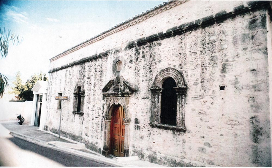 Βενετοκρατίας. Εκτιμά ακόμη ότι το πυργοειδές ορθογώνιο καμπαναριό (το οποίο είχε ήδη παραμορφωθεί μετά την πτώση της πυραμοειδούς στέγης του από σεισμό το 1887) ανήκει στην περίοδο της δυτικής κυριαρχίας.