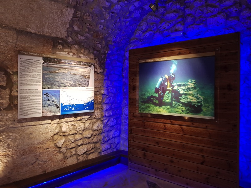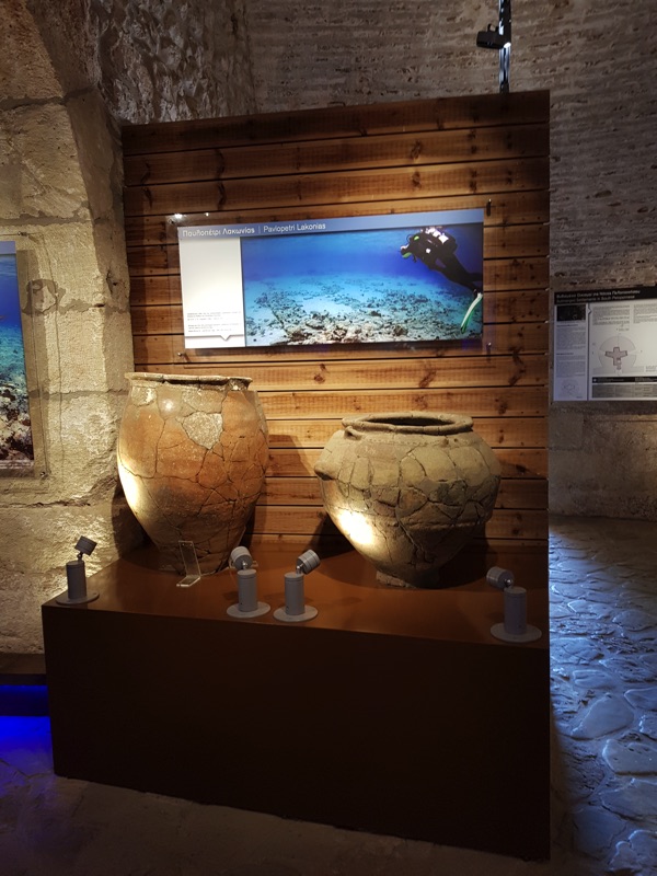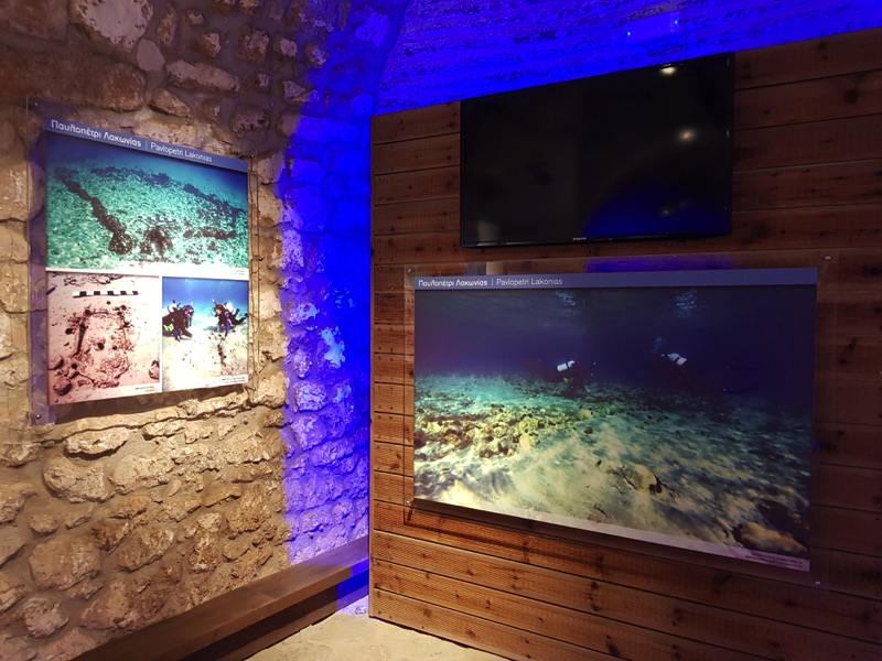 Επίσης, εκτίθενται φωτογραφίες από τις υποβρύχιες αρχαιολογικές έρευνες και δύο αποθηκευτικοί πίθοι του 16ου - 15ου αι. π.Χ. από τον καταποντισμένο προϊστορικό οικισμό της Εποχής του Χαλκού στα Βιγκλάφια Βοιών Λακωνίας κοντά στη νησίδα Παυλοπέτρι του Δήμου Ελαφονήσου. Οι πίθοι χρησιμοποιούνταν ως αποθηκευτικά αγγεία στη νότια ηπειρωτική Ελλάδα κατά τους προϊστορικούς χρόνους.