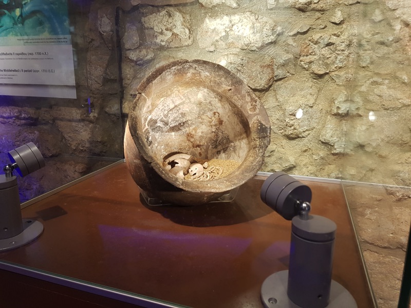 Ενα από τα αντικείμενα της έκθεσης που εντυπωσιάζει είναι ένας ταφικός πίθος (εγχυτρισμός) της Μεσοελλαδικής περιόδου (περίπου 1.700 π.Χ.) που βρέθηκε στον όρμο της Μεθώνης.
