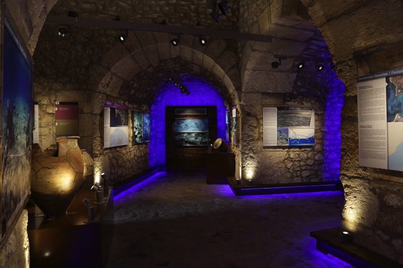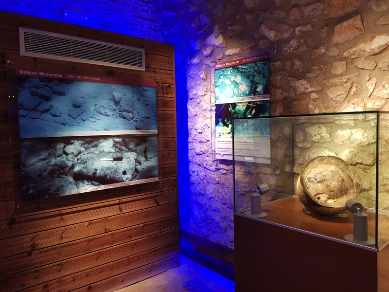 Η μικρή σε μέγεθος αλλά φροντισμένη και με ενδιαφέροντα εκθέματα έκθεση ενάλιων αρχαιοτήτων με τίτλο «Αρχαίες βυθισμένες πόλεις Νοτίου Πελοποννήσου» είναι αφιερωμένη στους βυθισμένους οικισμούς της Νότιας Πελοποννήσου και παρουσιάζει τα κατάλοιπα τριών βυθισμένων οικισμών: της Μεθώνης, του Παυλοπετρίου και της Πλύτρας. Σε συνδυασμό με την έκθεση του Κτηρίου Πασά για τα ναυάγια της περιοχής, στοχεύει στην παρουσίαση του αντικειμένου της Ενάλιας Αρχαιολογίας και αναδεικνύει ένα ακόμη από τα αντικείμενα έρευνας της Εφορείας Εναλίων Αρχαιοτήτων (ναυάγια, βυθισμένες πόλεις, αρχαίες λιμενικές εγκαταστάσεις). Παράλληλα σκοπεύει να μυήσει τον επισκέπτη στα μυστικά της θάλασσας, να τον γοητεύσει και να τον κάνει κοινωνό της υποβρύχιας αρχαιολογικής έρευνας.