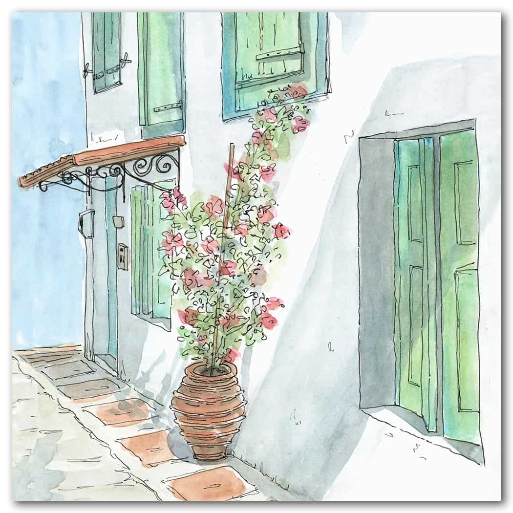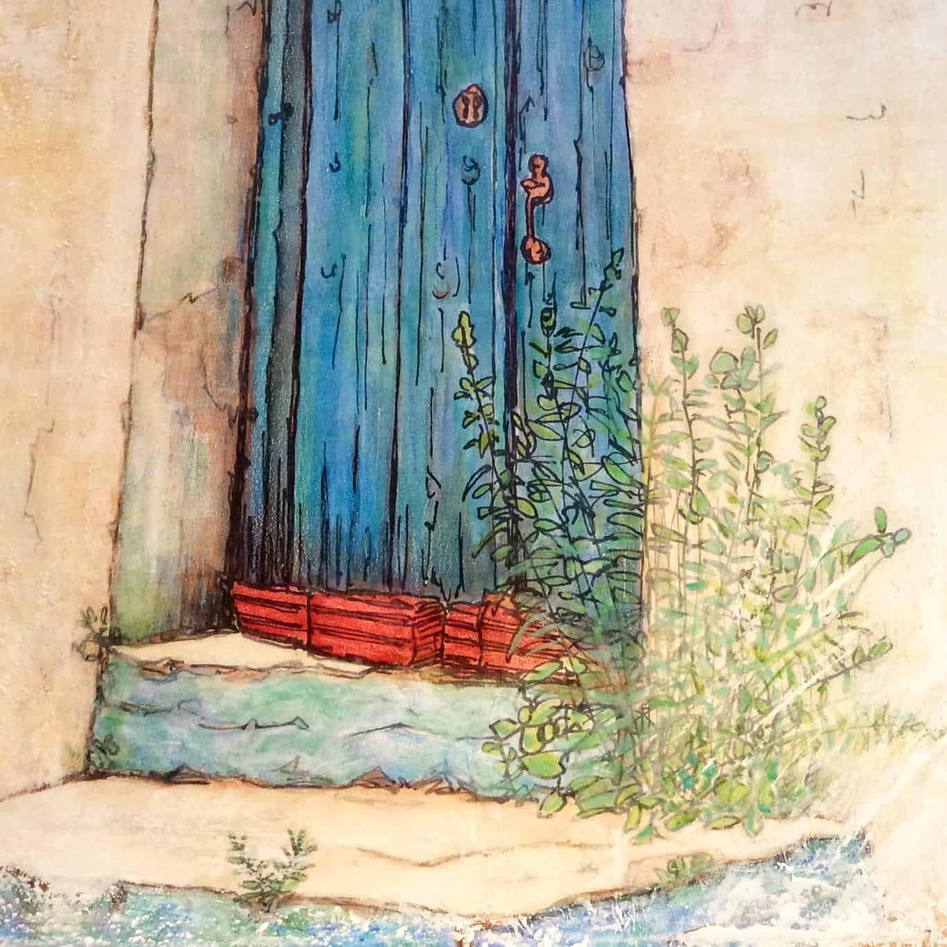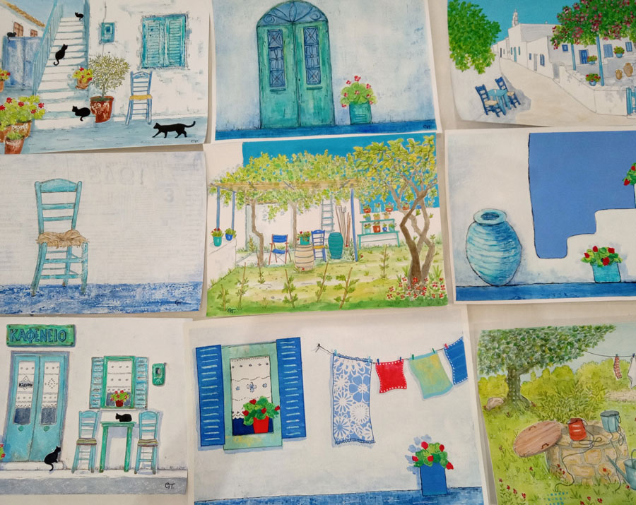Με την πάροδο των χρόνων, νιώθω πιο σίγουρη και ολοκληρωμένη ως καλλιτέχνης-όπως όλα, βελτιώνεσαι με την εξάσκηση! Εχω εξερευνήσει πολλές τεχνικές και έχω αναπτύξει τις δικές μου προσεγγίσεις στο κολάζ, τη μεταφορά εκτύπωσης, τη μονοτυπία και άλλα. Επιλέγω πάντα θέματα που με συναρπάζουν -για παράδειγμα, αγαπώ τα παλιά σπίτια του χωριού, τις αρχιτεκτονικές λεπτομέρειες, τις πόρτες, τα ξεφλουδισμένα παντζούρια, τα γεράνια σε γλάστρες, τις καρέκλες ταβέρνας κτλ.