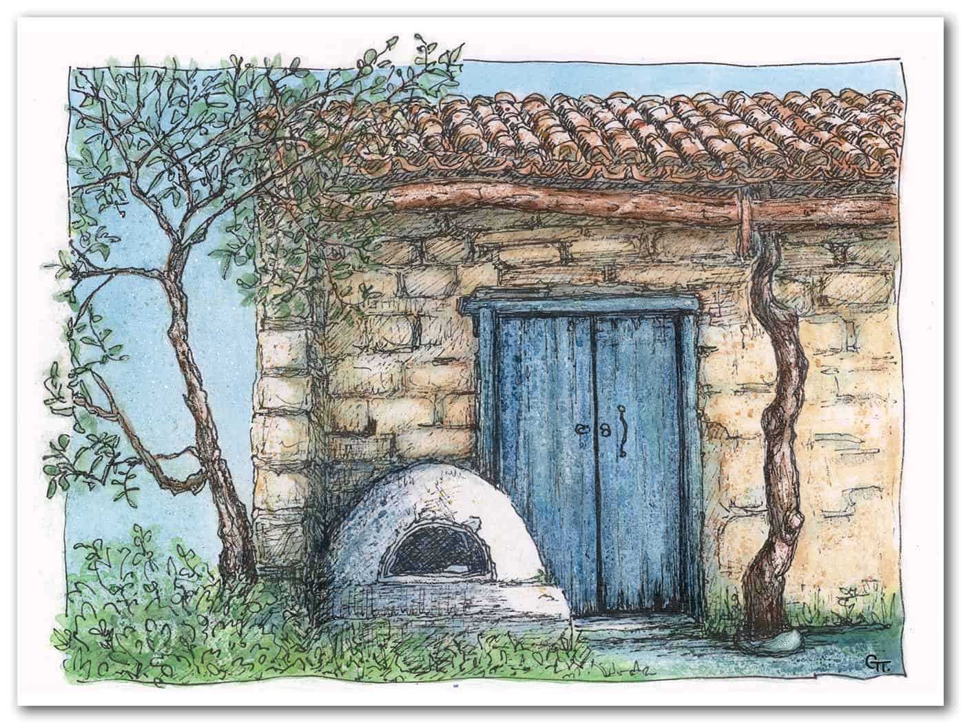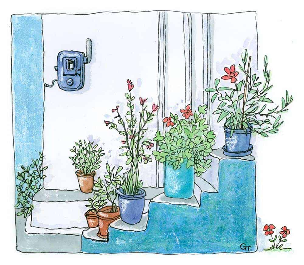 Ανοίγω το στούντιο-κατάστημά μου στις 9:30 π.μ. και κλείνω γύρω στις 2 μ.μ. για μεσημεριανό, όπως και τα υπόλοιπα καταστήματα του χωριού, και ανοίγω ξανά από τις 6 μ.μ. μέχρι τις 9 μ.μ. (οι ώρες ποικίλλουν ανάλογα με την εποχή). Μένω στα ήσυχα πίσω δρομάκια του Χαρακοπιού, λιγότερο από 2 λεπτά με τα πόδια από το κατάστημά μου στον κεντρικό δρόμο, οπότε περνώ τακτικά από παλιά κτίρια που έχω σχεδιάσει και ζωγραφίσει όλα αυτά τα χρόνια. Μου αρέσει να βρίσκομαι στο επίκεντρο των πραγμάτων και να έχω επαφή με τους άλλους ιδιοκτήτες καταστημάτων - με βοηθά να ενημερώνομαι για τα τοπικά νέα και να εξασκώ τακτικά τη γλώσσα.