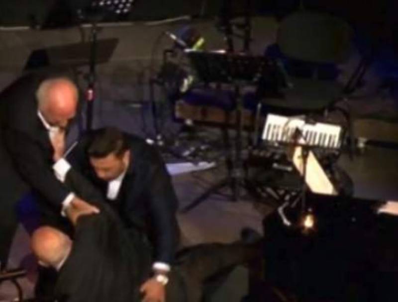 Όταν οι τρεις μεγάλοι μουσικοσυνθέτες ανέβηκαν στη σκηνή, ο κ. Πλέσσας παραπάτησε, έχασε την ισορροπία του και έπεσε. Όπως ήταν αναμενόμενο, οι θεατές τρόμαξαν, αλλά με τη βοήθεια του κ. Χατζηνάσιου και του κ. Θεοφάνους, ο σπουδαίος μουσικοσυνθέτης σηκώθηκε και δέχθηκε το πιο θερμό χειροκρότημα.