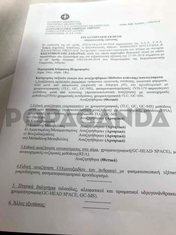 Σύμφωνα με την εργαστηριακή έκθεση της τοξικολογικής εξέτασης του θύματος, που φέρνει στη δημοσιότητα το popaganda.gr δεν βρέθηκε ίχνος από ναρκωτικά στο αίμα του.