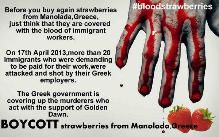 Μέσα σε χρόνο ρεκόρ, η οργή που ξεχειλίζει για όσα έγιναν στη Μανώλα, οδήγησαν ακόμη και στη δημιουργία αφισών που καλούν σε μποϊτοτάζ στις φράουλες της περιοχής. Μάλιστα ένα από αυτά έχει και αγγλικό εκτενές κείμενο, ενώ ήδη διεθνείς ιστοσελίδες έχουν εκτεταμένες αναφορές τόσο στο γεγονός καλώντας το κοινό τους να λάβουν μέρος στο μποϊκοτάζ.