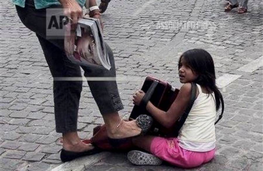 Στην επίμαχη εικόνα, μια γυναίκα φαίνεται να κλωτσάει ένα μικρό κοριτσάκι που παίζει ακορντεόν στον πεζόδρομο της Ακρόπολης, κοντά στον παρακείμενο σταθμό του Μετρό, μπροστά στα μάτια τουριστών.