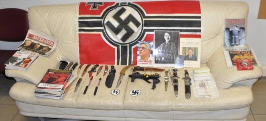 Στην έρευνα που έγινε από αστυνομικούς στο σπίτι του βρέθηκαν και κατασχέθηκαν τρία μεταλλικά ξιφίδια, δύο εκ των οποίων φέρουν ναζιστικά σύμβολα, 12 μαχαίρια, δύο στικ ακονισμού μαχαιριών και 64 φαρμακευτικά δισκία, τα οποία στερούνταν της απαραίτητης ιατρικής συνταγής, επιγράμματα ενδυμάτων με ναζιστικά σύμβολα, έντυπο υλικό με περιεχόμενο σχετικό με τη Χρυσή Αυγή, τη δικτατορία και τον Αδόλφο Χίτλερ και δύο φωτογραφίες του Χίτλερ.