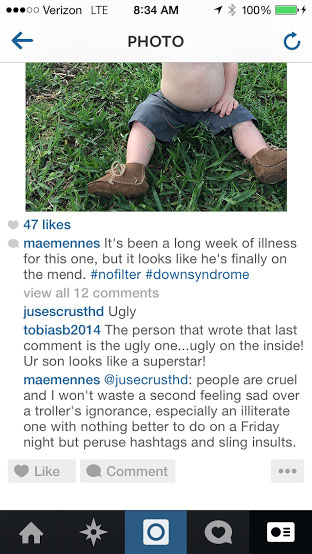 Δεν θέλω να κάνω υποθέσεις για σένα, αλλά θεωρώ πως δεν έχεις ιδέα το πόσο ανήμποροι αισθάνονται οι γονείς όταν φροντίζουν ένα άρρωστο βρέφος με αναπνευστικά προβλήματα. Ο Quinn ήταν άρρωστος όλη την προηγούμενη εβδομάδα αλλά την Παρασκευή αισθάνθηκε πολύ καλύτερα. Αποφασίσαμε να κάτσουμε στην αυλή και να ‘ρουφήξουμε’ λίγο ήλιο μετά το σχολείο. Δεν υπάρχουν πολλά πράγματα σε αυτόν τον κόσμο που να συγκρίνονται με το να βλέπεις τον πρόσφατα άρρωστο γιο σου να λάμπει με ένα χαμόγελο! Και έτσι τον απαθανάτισα σε μερικές φωτογραφίες για να γιορτάσουμε την ανάρρωση. Έπειτα τις ανάρτησα στο Instagram με την ετικέτα #downsyndrome. Μ΄αρέσει να τις ξανακοιτάζω στον ελεύθερό μου χρόνο, γιατί αυτά τα παιδιά είναι αξιαγάπητα. Εσύ λοιπόν, JusesCrustHD σκέφτεσαι διαφορετικά, καθώς βλέποντας τη φωτογραφία του μωρού μου θεώρησες καλό να αφήσεις σαν σχόλιο μια απλή λέξη: