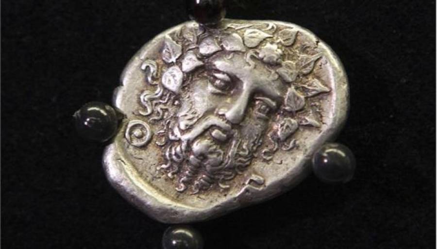 - 4. Ασημένιος στατήρας Θηβών (c. 405-395 πΧ). Απεικονίζει κεφαλή Διονύσου στην μια όψη και την ασπίδα των Βοιωτών στην άλλη.