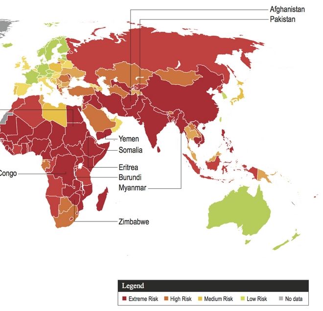 Η έκθεση έχει συμπεριλάβει 197 χώρες. Στην λίστα υπάρχουν και ανεπτυγμένες χώρες, ενώ ακόμα και η Αμερική χαρακτηρίζεται ως χώρα "μέσου κινδύνου".