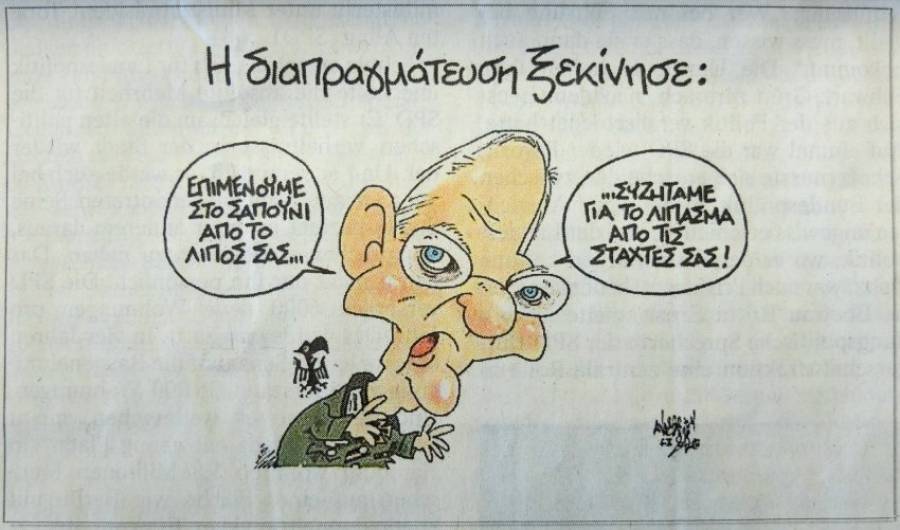 «Επιμένουμε στο σαπούνι από το λίπος σας… Συζητάμε για το λίπασμα από τις στάχτες σας» ανέφερε ο Σόιμπλε στο σκίτσο υπό τη λεζάντα «η διαπραγμάτευση ξεκίνησε».