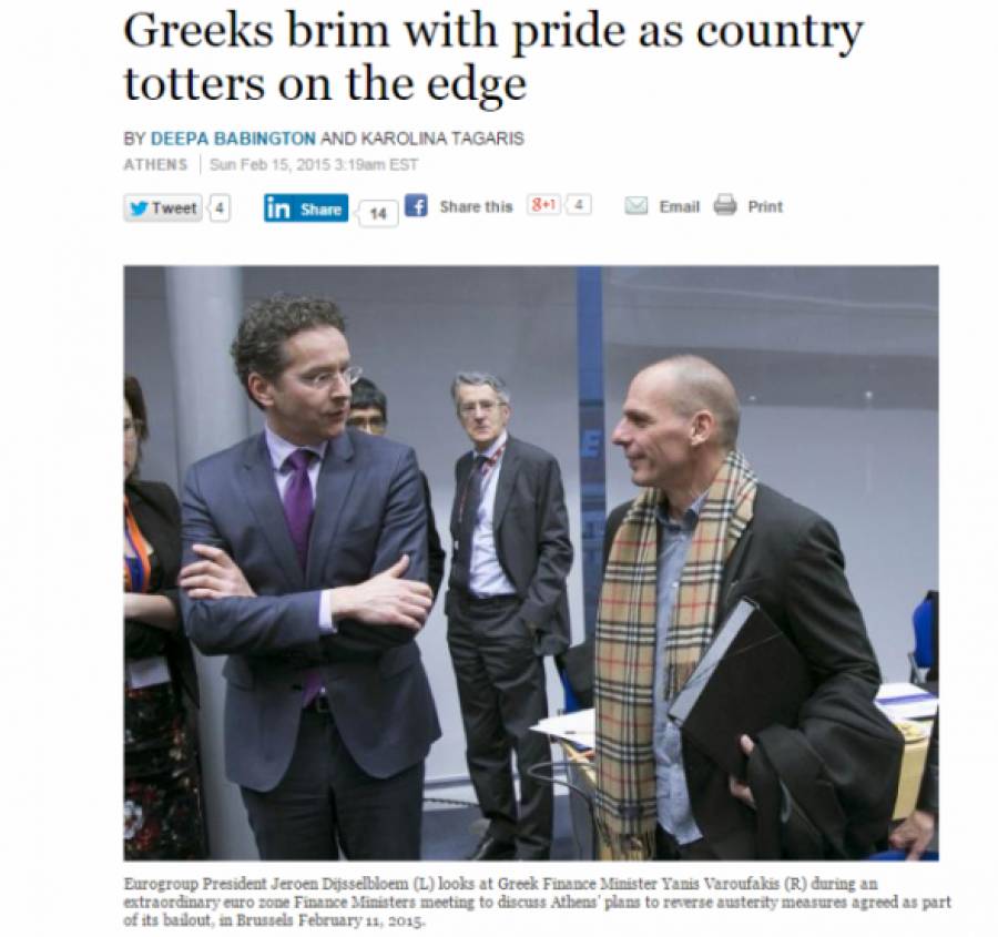 «Το μήνυμα της επικείμενης καταστροφής φαίνεται πως περνάει απαρατήρητο στους δρόμους της Αθήνας, όπου ένα κλίμα ελπίδας και αισιοδοξίας και ευφορίας βασιλεύει, με τους Έλληνες να βλέπουν τους εαυτούς τους να τινάζουν επιτέλους τα ξένα δεσμά και να διαμορφώνουν μόνοι τους την μοίρα τους», σημειώνει το δημοσίευμα του Reuters το οποίο υπογραμμίζει πως φαίνεται ότι τόσο η ελληνική κυβέρνηση, όσο και οι Έλληνες πολίτες δεν φαίνεται να αντιλαμβάνονται το μέγεθος της επικείμενης καταστροφής σε περίπτωση «ναυαγίου» των διαπραγματεύσεων με τους εταίρους της χώρας.